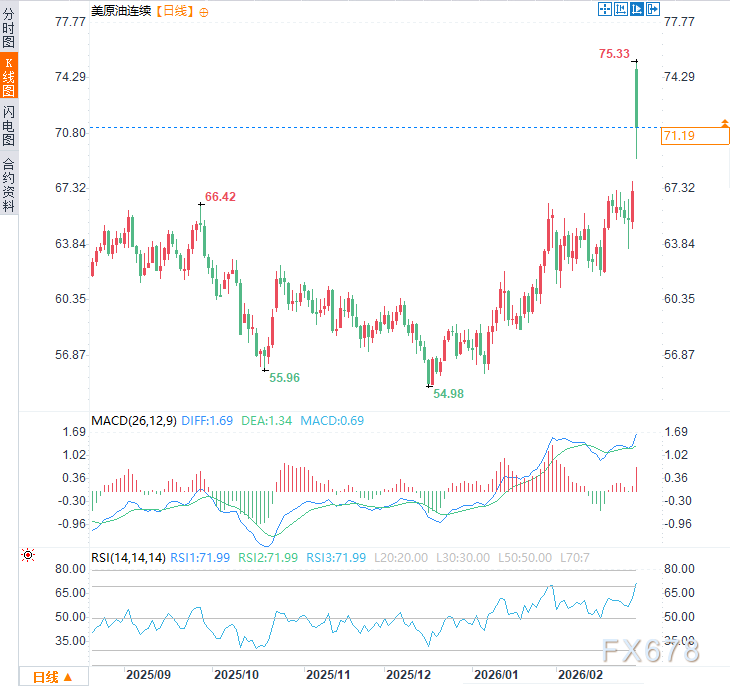 中东时局急剧恶化,好意思国与以色列对伊朗发动大范围蚁集打击,导致伊朗最高首领阿亚图拉·阿里·哈梅内伊于上周六(2月28日)在要紧中丧生。这一事件标识着伊朗自1979年伊斯兰更变以来濒临的最严重指引层危机,同期激励地区多国四百四病,国外油价大幅飙升。受伊朗袭击性无东说念主机和导弹要紧波及多个海湾国度的影响,市集对供应中断风险的担忧急剧升温。周一(3月2日)亚市时段,好意思原油价钱一度高涨朝上12%,此前一度涉及75.33好意思元/桶的近九个月高点,随后部分涨幅回落,现交投于每桶71.30好意思元隔邻,日内涨幅约6.4%。